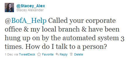 Due to some extenuating circumstances, I really needed to talk to my bank–Bank of America. I called them to no avail. In fact, I had to enter my card number twice, pushed the zero about 20 times only to discover it does nothing, and got hung up on three times. I was enormously frustrated. That’s when I took it to Twitter.